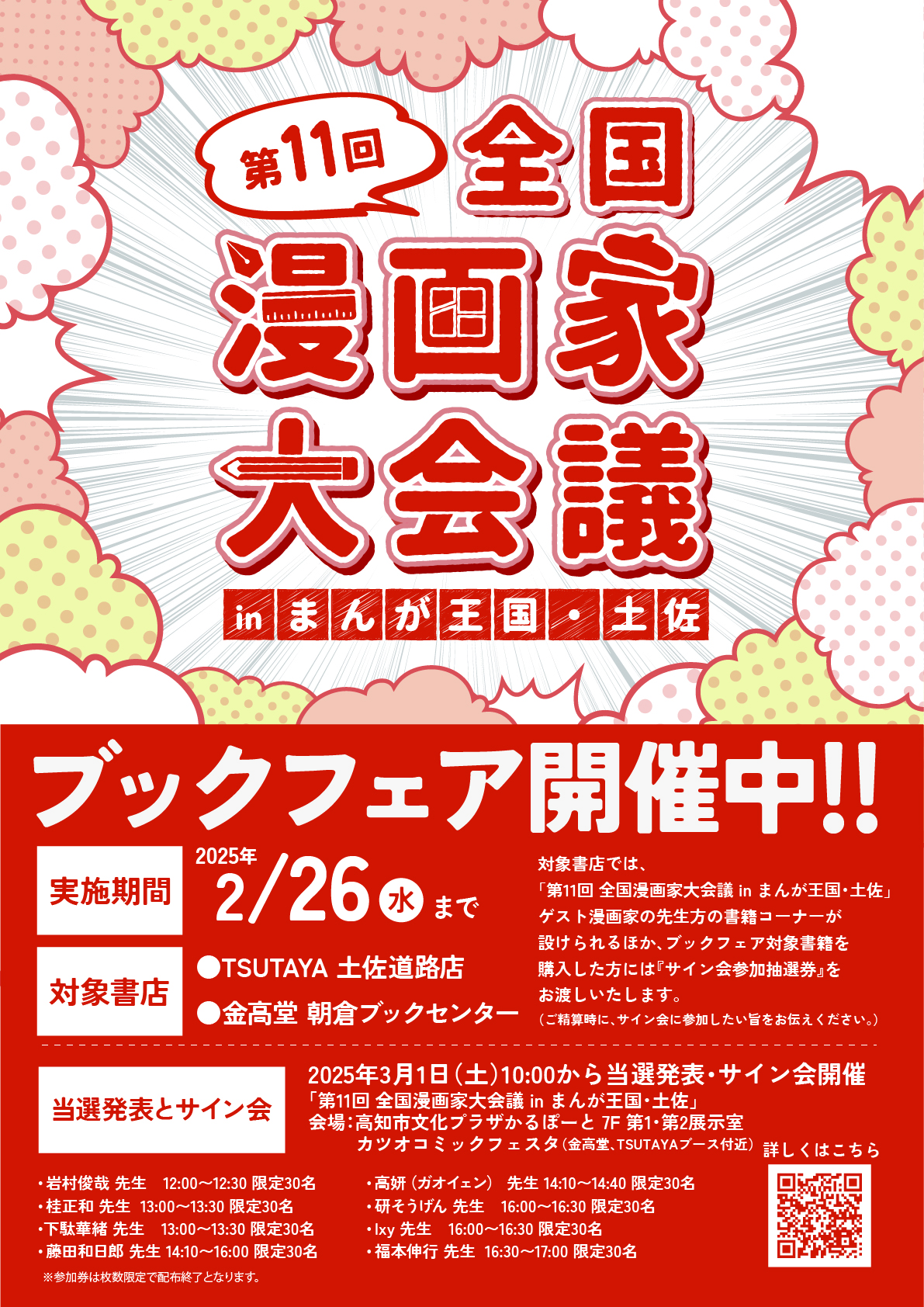 ・3月1日(土)「第11回 全国漫画家大会議 in まんが王国・土佐」かるぽーと7Fイベント会場に、お買い求めいただいた書籍と『サイン会参加抽選券』をご持参のうえ、サイン会各開始時間までにサイン会ブースにお集まりください。