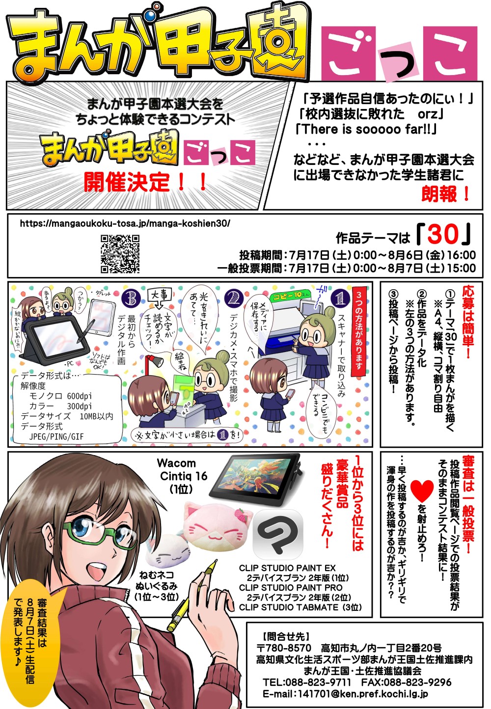 ・テーマに沿った1枚まんが(コマ割自由)をA4サイズ(210×297mm)で制作する。 Produce a one page manga (A4, 210x297mm) based on the theme. ・手書きの原稿をスキャニング(または撮影)してデータ化することも可 For non-digital works, digitize them before submission, through methods like scanning. ・投稿できるのは、1名(または1チーム)につき1作品まで Only one entry per person or per group is allowed. ・作品に使用する言語は問わない There are no restrictions on the language used in the manga. ・投稿の際は原稿を横1000ピクセル程度にリサイズし、JPEG、PNG、GIF(アニメーションは除く)のいずれかの形式で、1ファイル10MB以内 The artwork should be resized to 1000 pixels wide upon submission, and be within 10MB, in the format of JPEG, PNG, or GIF. |