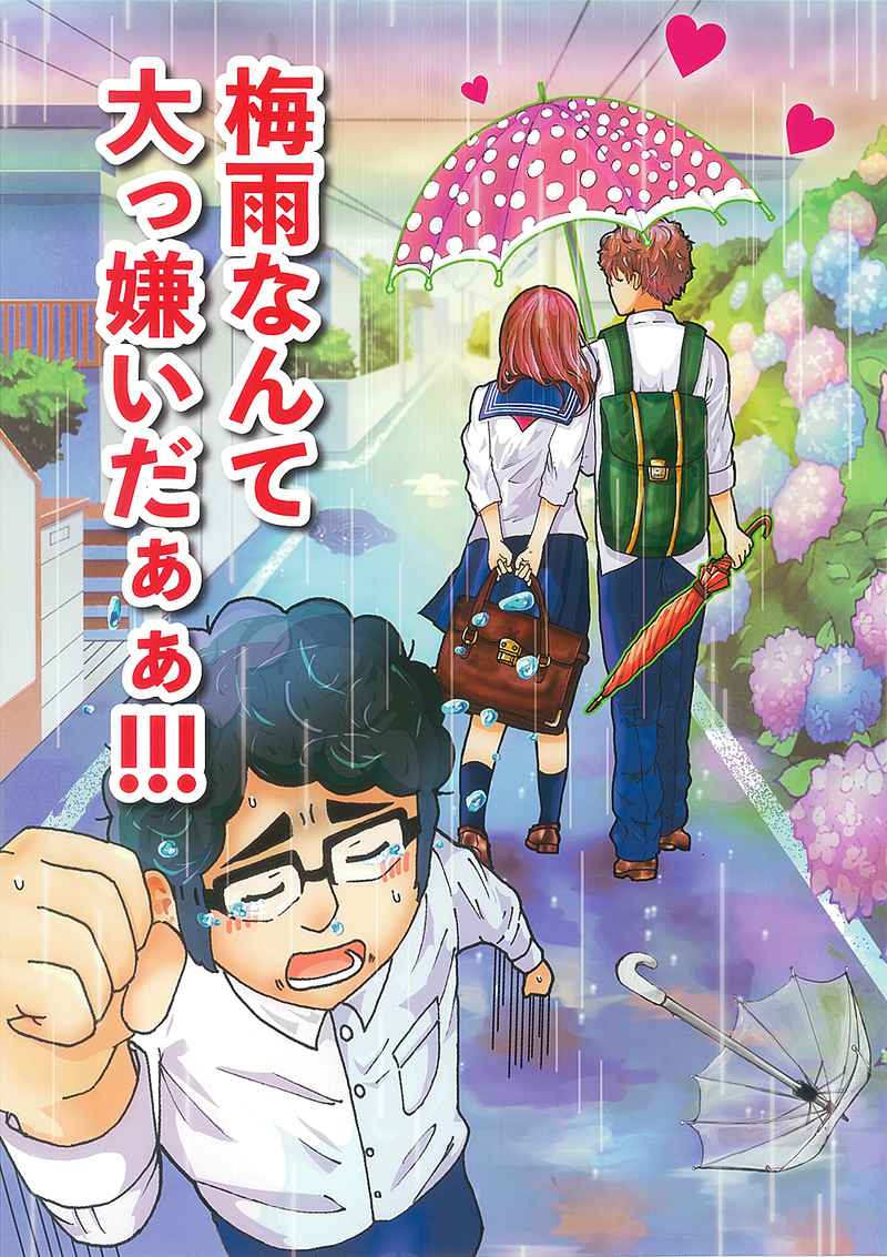 雨降りの相合傘。よく見ると彼氏はもう1本傘を持っています。それなら2人で1本ずつ差せよと思うけど、実は差した傘は彼女が雨に濡れない為、畳んだ傘は彼女と相合傘で歩きたい自分の為という二刀流。それに気づいた非モテ少年の悔しがりようと言ったら…。