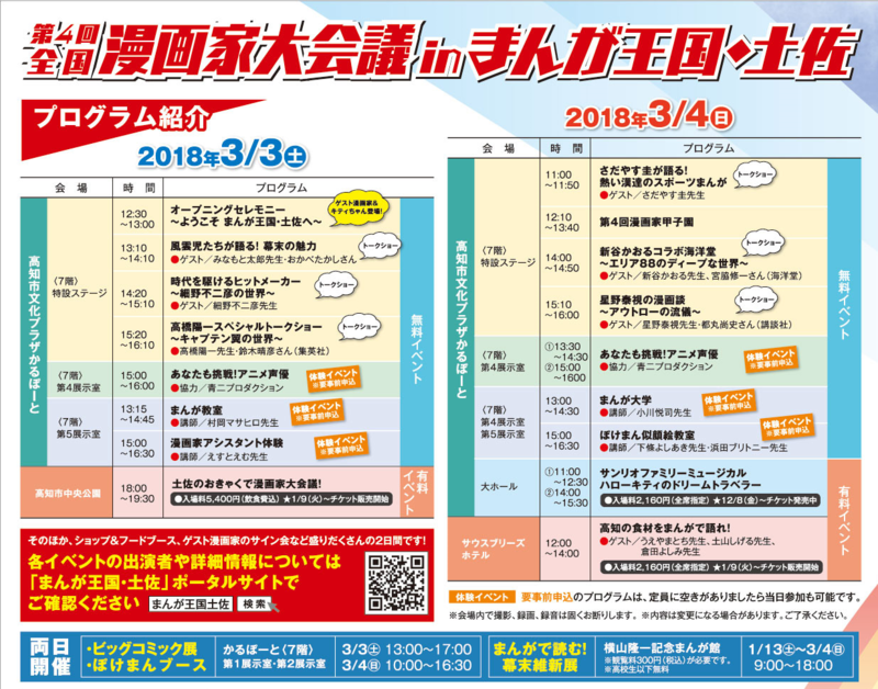 ホーム > まんが家を志すあなたへ > 第7回全国漫画家大会議 in まんが王国・土佐 出演者紹介 > 【チケット払い戻し・漫画家サイン対応について】第6回全国漫画家大会議inまんが王国・土佐 > 【中止のお知らせ】第6回全国漫画家大会議inまんが王国・土佐 > 【大会議】声優トークショーチケットについて > 【大会議】イベントプログラム > 第6回全国漫画家大会議 ゲスト漫画家 > イベントレポート 第5回全国漫画家大会議 in まんが王国・土佐 > 【大会議】会場アクセス > 【大会議】 無料体験イベント > 開催決定 「第6回全国漫画家大会議 in まんが王国・土佐」 > 【レポート公開】池田秀一&古谷徹トークショー > 世界まんがセンバツ 結果発表 > ケロロ展グッズ販売情報 > 第5回全国漫画家大会議 開場及びサイン会に関するお知らせ > 第5回全国漫画家大会議ゲストへの手紙・プレゼントの受付について > 【大会議】有料チケットについて > 【大会議】イベントプログラム > 【大会議】ブックフェアの開催について > 全国漫画家大会議×ナンコクフェスティバル スタンプラリー > 【大会議】第5回全国漫画家大会議ゲスト一覧 > 【大会議】 無料体験イベント > 「ケロロ展 IN AREA 103」 ケロロ軍曹生誕20周年記念 吉崎観音作品展 > 第5回全国漫画家大会議inまんが王国・土佐の詳細について > 【大会議】会場アクセス > 全国漫画家大会議オリジナル料理 > 【大会議】漫画家サイン会 > 【大会議】 無料体験イベント募集中です! > 【大会議】イベントプログラム