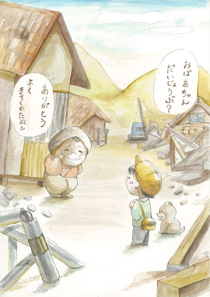 被災し、生きる気力を失いかけていたおばあちゃん。遠方から孫が訪ねてくる。また、この孫のためにも頑張って生きていこうと思えてくるおばあちゃん。弱りきった心を、一瞬にして、温め元気にする孫の訪問、これぞスーパーボランティア!