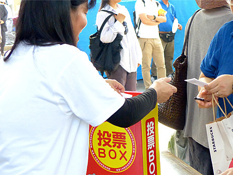 呼びかけも功を奏して、作品の前に一般の方々が続々と集まり、各自一番気に入った作品に投票です!!