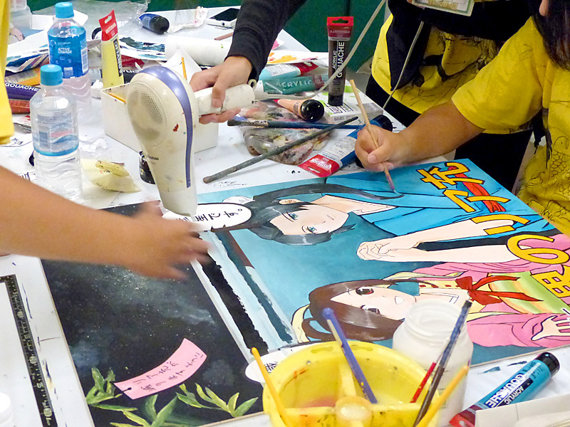 前日の深夜まで敗者復活をかけて「女子力男子」のテーマで作品を描いた選手が、早朝に敗者復活戦の審査会場となる『ひろめ市場』に集まりました。