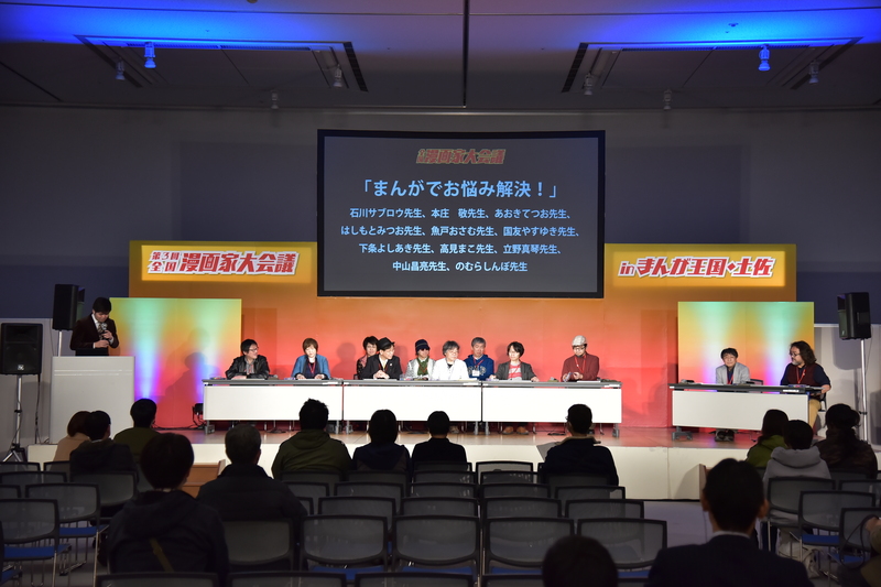 一般の人から募集したお悩みを漫画家の先生方に解決策を考えていただき、それを漫画にしてもらおうというコーナー。ユニークな発想と鋭い切り口の漫画が次々と披露され、時に真面目に、時にユーモアたっぷりのトークで会場は笑いの渦に包まれました。
