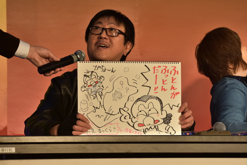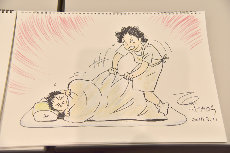 のむらしんぼ(以下、のむら):僕は「コロコロコミック」で子ども漫画中心なんで、シンプルに。これ(つるピカハゲ丸の)ハゲ丸のかあちゃんなんですけど、ハゲ丸がおねしょして(布団から)出れない。先にお知らせしとくのは、作者の私の気持ちがお先真っ暗って気持ちで、徐々に感づいてきましたね、ダジャレ攻めっていう。子ども漫画というのはすぐに、ずっこけたり、ガチョーンって飛び出したりするので。まあ、こんなところです。でね、毛布じゃなくてね、ハゲ田家はそんなに金持ちじゃないんで、いつもの定番ですね。「布団がふっとんだ!」(笑)ダジャレじゃウケけが悪いですけどね。今の笑い声は苦笑いってやつですよね。(笑)ありがとうございました。(笑)