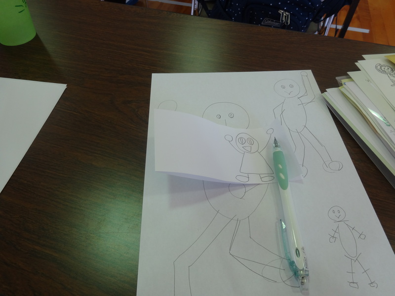 半分に折った紙をぱらぱらまんがの要領で動かすことで、絵が動いているように見えます。「ないもの」が「あるもの」に変わるよりも、「少しある」ものが「大きくなった」ほうが、より、動いたという実感がします。そんな錯覚の不思議に、みんなで作品を見せ合いながら、夢中になって作品制作に取り組みました。