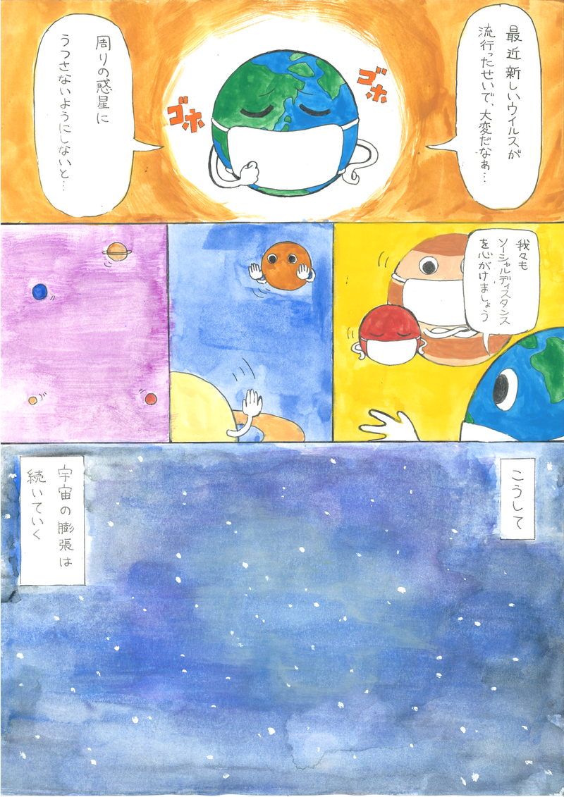 何もない宇宙ネタの何もないコマで落とすっていうのが、何っ?!と初め思った一枚でした。宇宙はどんどん膨張している、っていう科学的小ネタをいれているのもとても面白かったのと、あとその小ネタをどんどん、あ、なるほど、というふうに知っていくと、この虚無を描いた最後のコマが希望に見えてくるかもしれない、というところがとても良いと感じました。