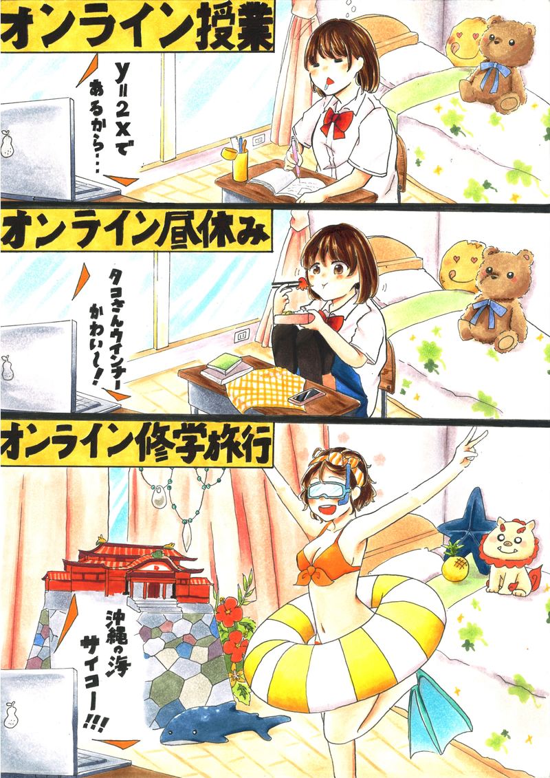 内容がだんだんエスカレートしていくような、まんがとしての演出をしっかり考えていらっしゃるだけじゃなくて、全体として高い完成度で描かれていたり、モノの差分がきちんと、修学旅行の小物が追加されている、みたいなところ、細かな気配りをして描かれているな、というところだったり、オンラインになってしまってできない事を前向きにやろうというところをとっても明るいテイストで描いてくださっていて、見て楽しい気持ちになれるのがいいなと思いました。
