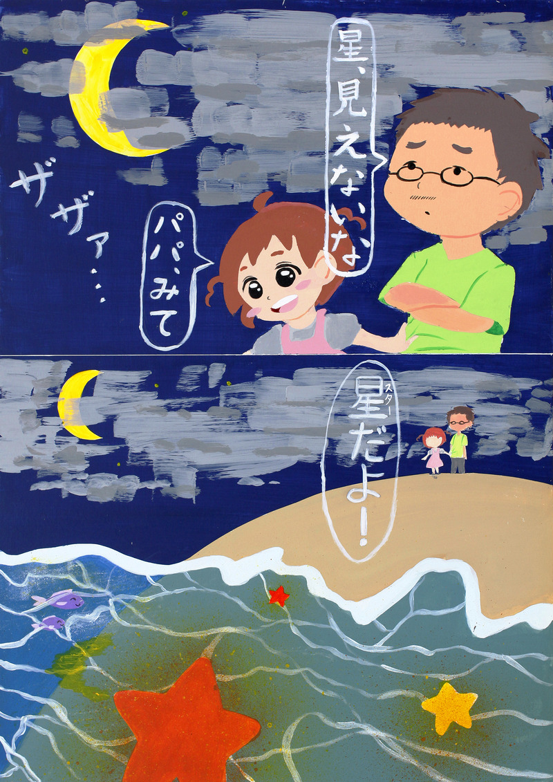 描いた高校生が「落ちていく星の表情に目をつけた」と話していたが、実にその通り。願いをかける流れ星が、諦めたように落ちる姿が笑いを誘う。
