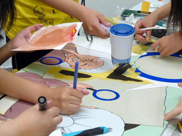 着色してはドライヤーで乾燥させたり、描画のできていない部分をお互いの腕をクロスさせながら最後の最後まで魂を込めて仕上げています!!