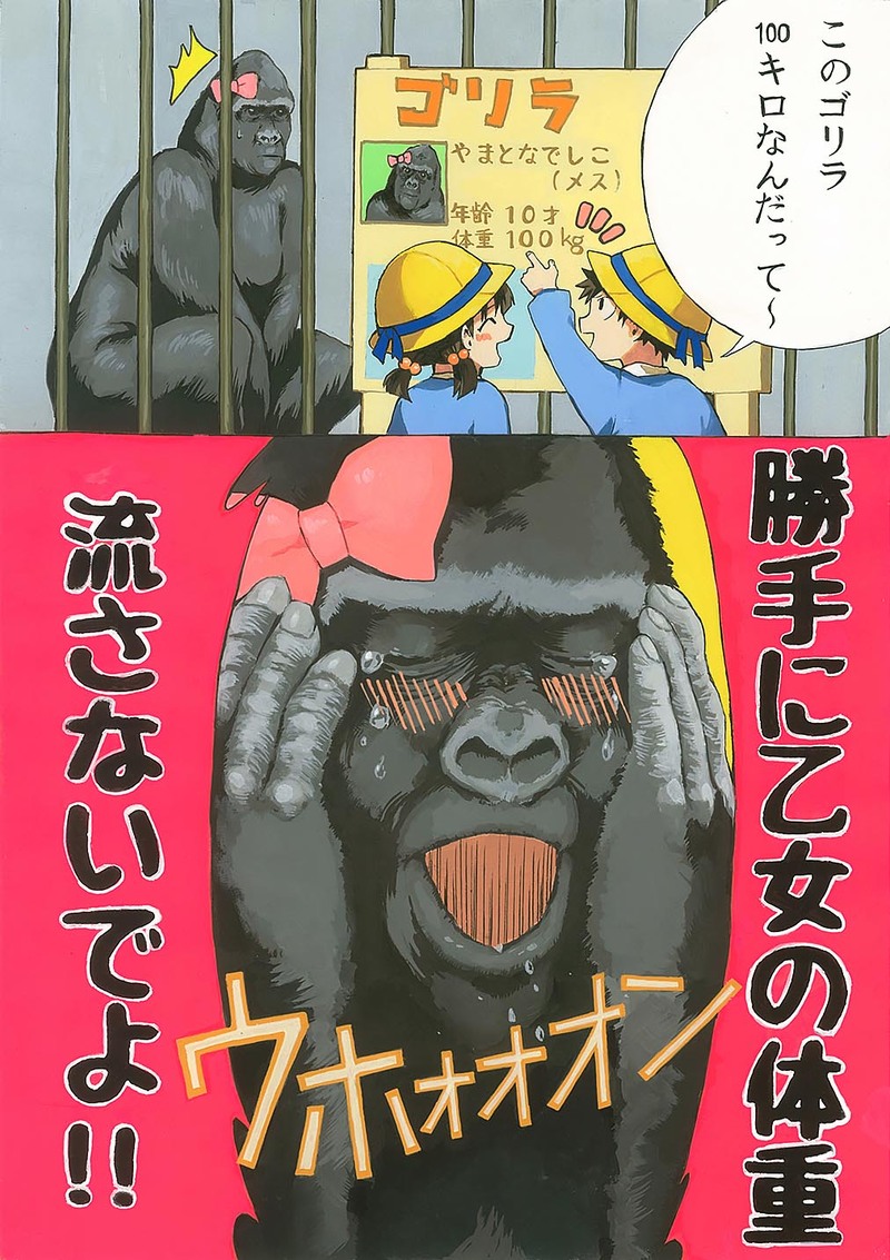 [体重何キロ?」そう聞かれても中々教えたくないものですよね。秘密にしていたい!そんな気持ちがゴリラにもある筈。自分の秘密の体重が看板に書かれ毎日多くの人に知られてしまうやまとなでしこちゃんは凄く恥ずかしい思いをしている。だって乙女だもの~!