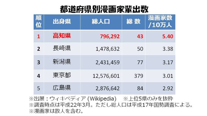 県民10万人あたりのまんが家輩出割合が10万人に対して5人とダントツ全国1位であるということや、まんが甲子園、やなせたかし記念館アンパンマンミュージアムや横山隆一記念まんが館、海洋堂ホビー館四万十などのまんが関連施設を紹介。