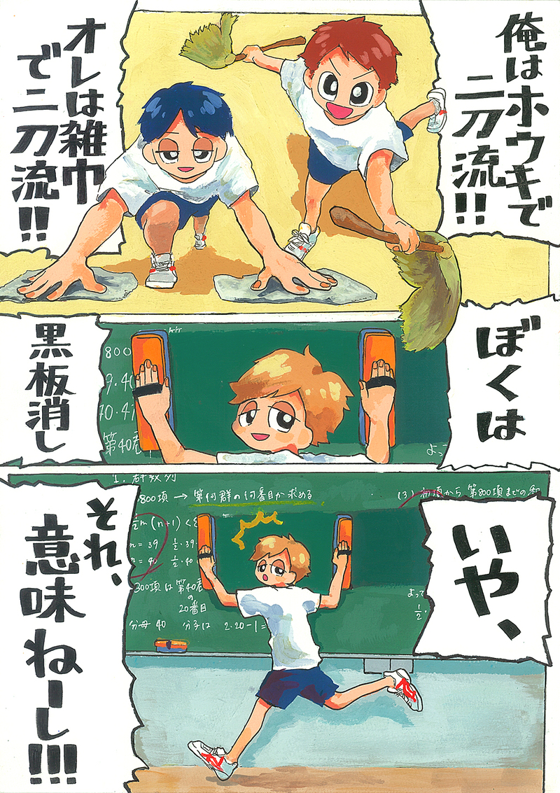 身近な生活の中に『二刀流』はないか、ということで探した題材です。ホウキと雑巾は効率の良い仕事をしている一方、黒板消しは同じ部分を消しているだけ、というオチです。先輩の実体験が元になっています。