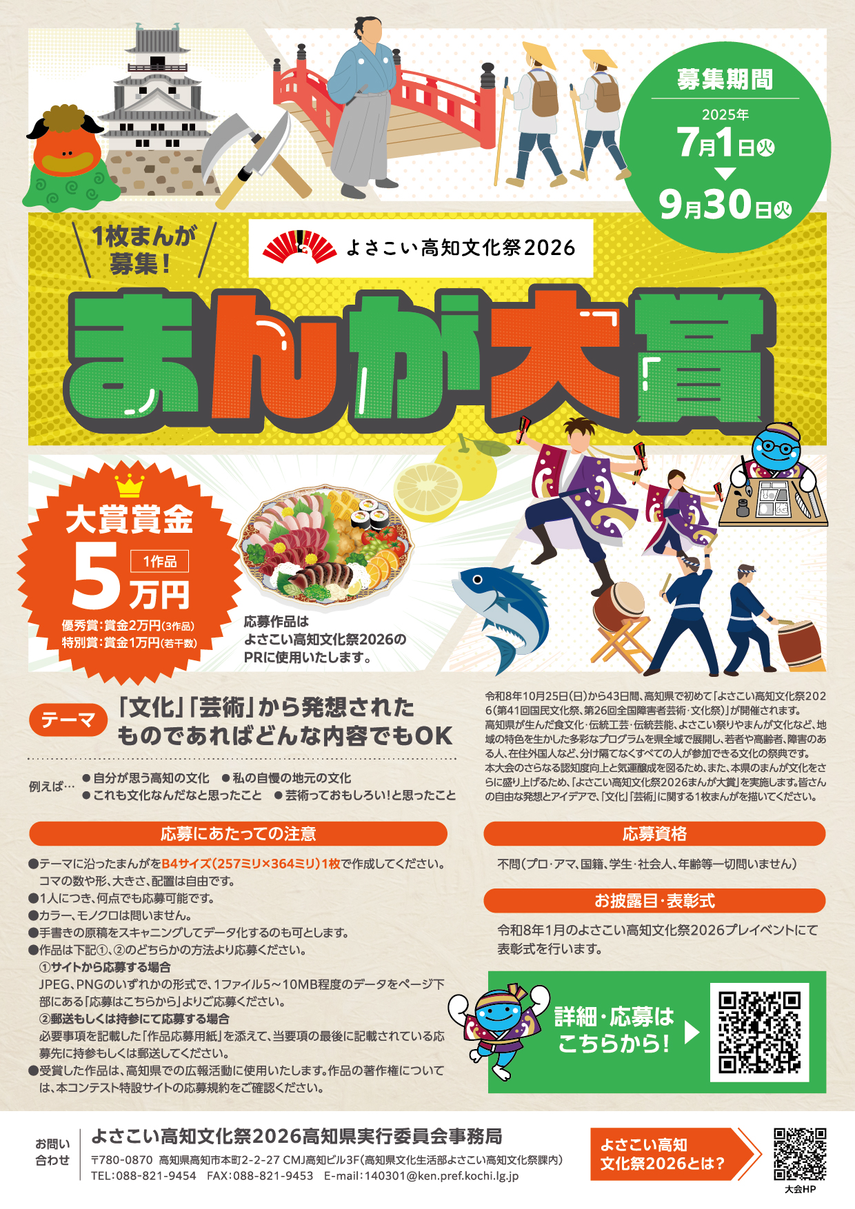 本大会のさらなる認知度向上と気運醸成を図るため、また、本県のまんが文化をさらに盛り上げるため、「よさこい高知文化祭2026まんが大賞」実施します。皆さんの自由な発想とアイデアで、「文化」「芸術」に関する1枚まんがを描いてください。